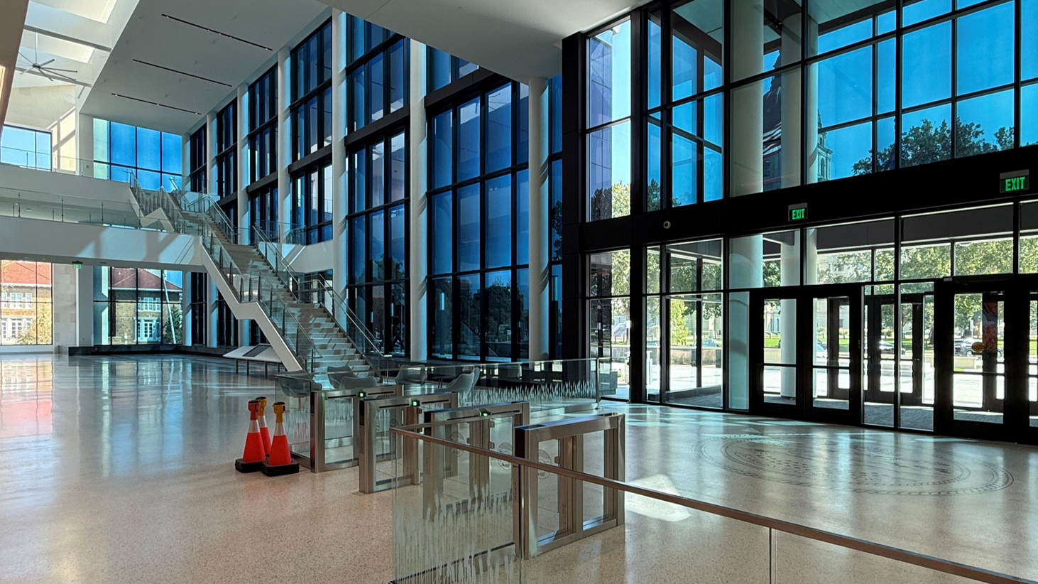 The company’s latest project is also its largest to date. Sowards Glass just finished the Docking State Office Building, which used new glass technology. Two sides of the building have custom glass that transitions from clear to dark, much like transition sunglasses, except the contrast is controlled electronically rather than by light levels. The operator can decide how dark the tint should be and program it to follow the sun, so windows darken as the sun rises in the east and lighten as it sets in the west.