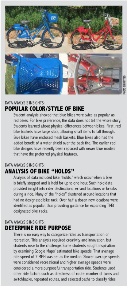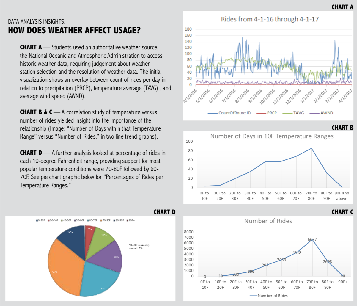 The students performed analysis of one full year of ride data spanning April 2016 to the end of March 2017. Students used Microsoft Excel and Microsoft Access, and visualizations were later created using the data visualization tool Tableau and PowerBI.